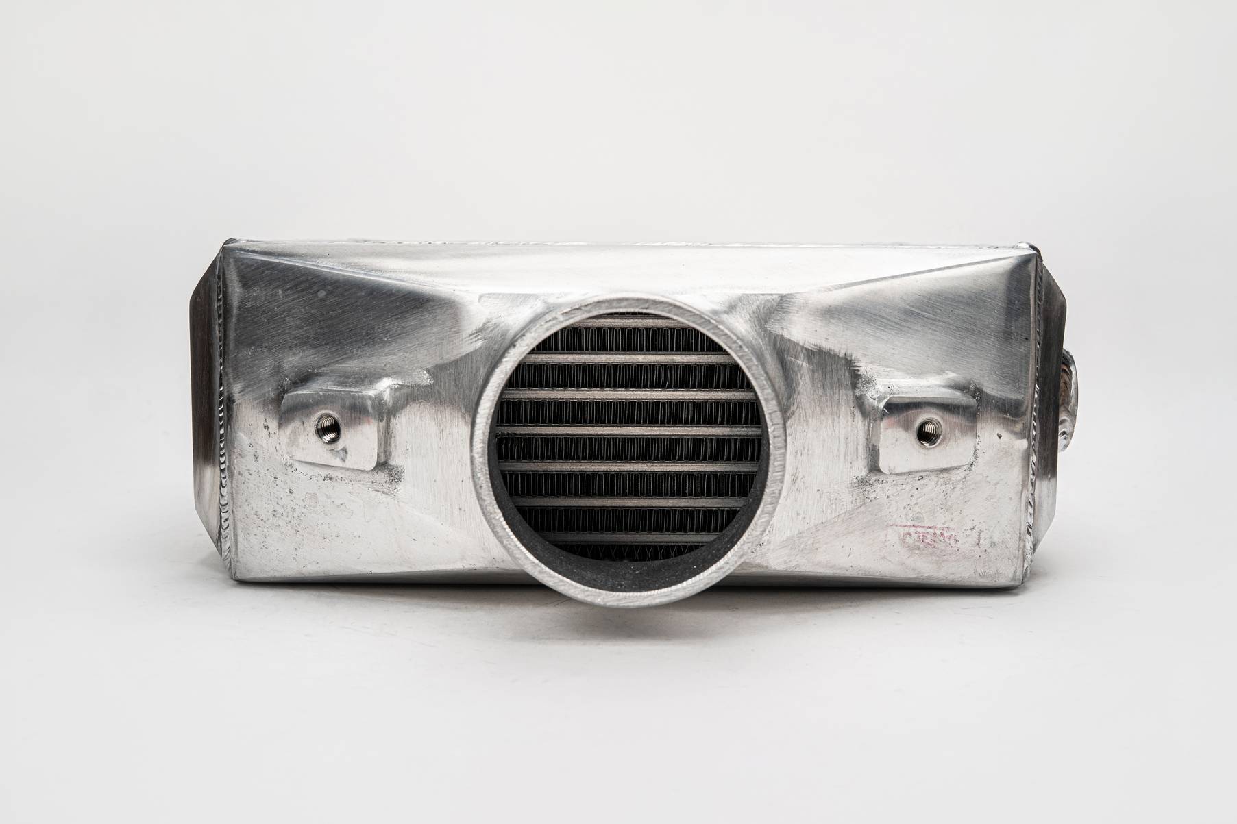 The inlet and outlet on this intercooler go directly through the intercooler; preventing the air from changing direction can result in better airflow.